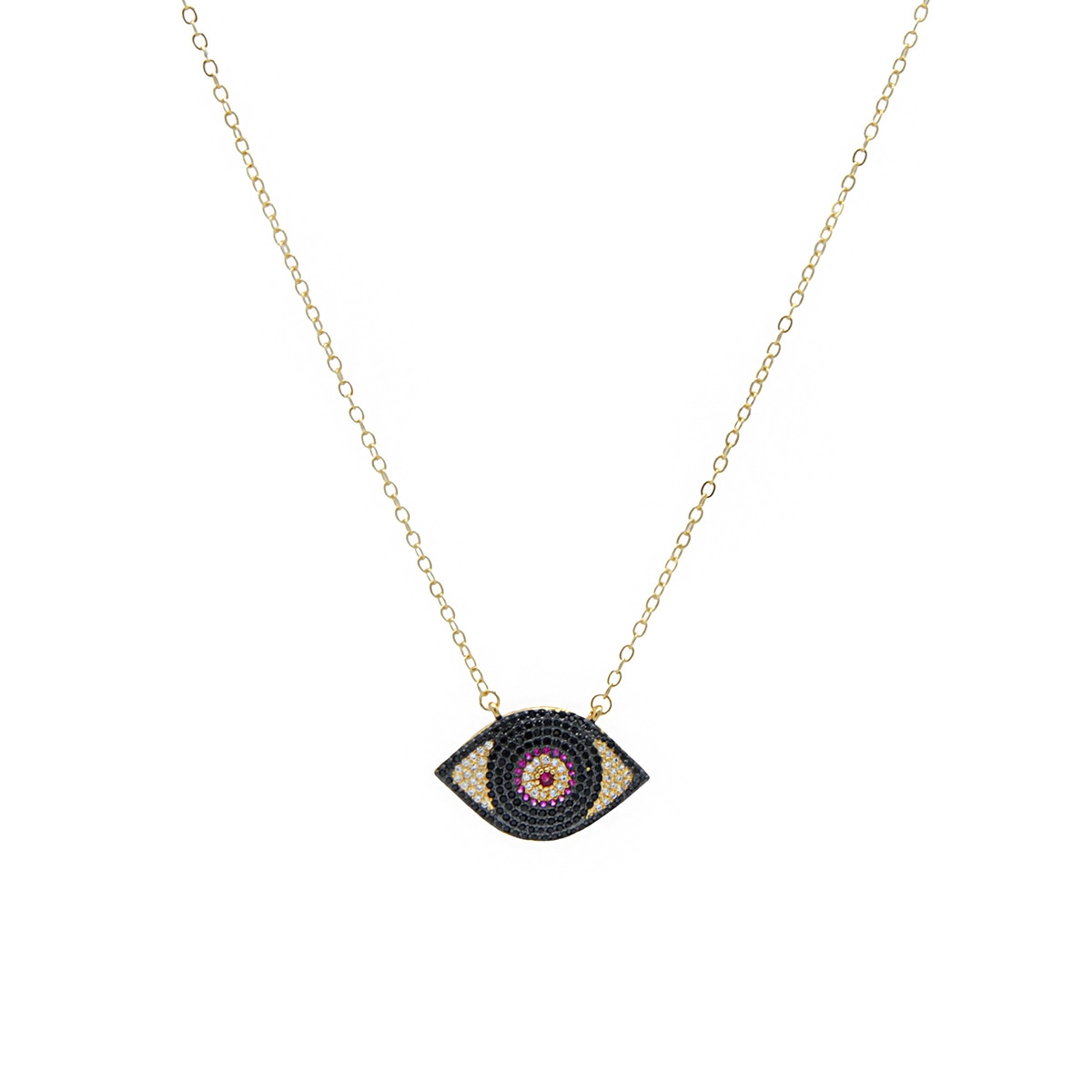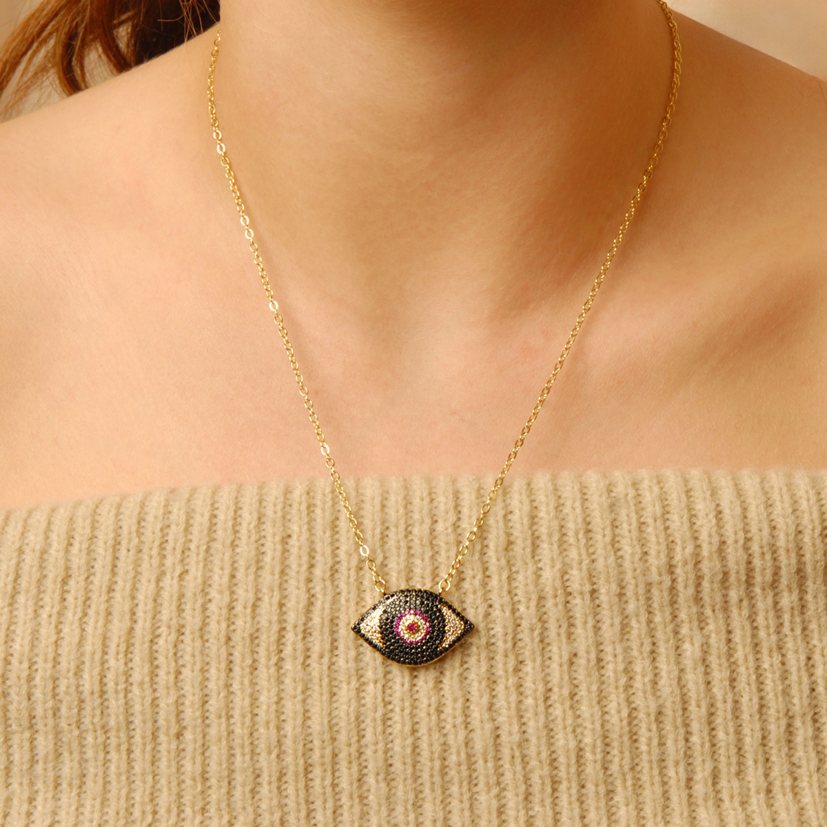 A popular trend for spiritual protection, good fortune, guidance, and peace, our gorgeous "I See You" eye pendant shimmers with stunning black, clear and fuchsia AAA cubic zirconia. 18" neckpiece with 2" extension. Nickel and lead free jewellery.