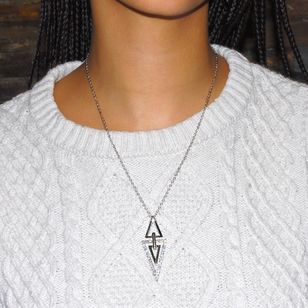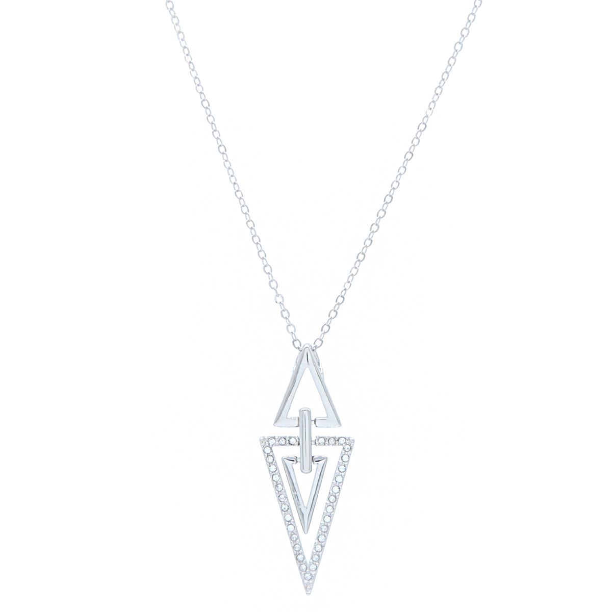 Flaunt your style with our chic and flattering “Pointed Opulence” neckpiece. This stunning fashion accessory features a sleek, triangular design combining smooth, polished bars and sparkling Swarovski crystal on a sleek 19" designer chain. Nickel and lead free jewellery.
