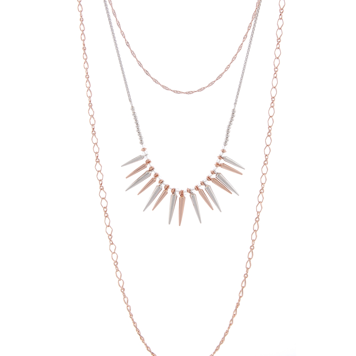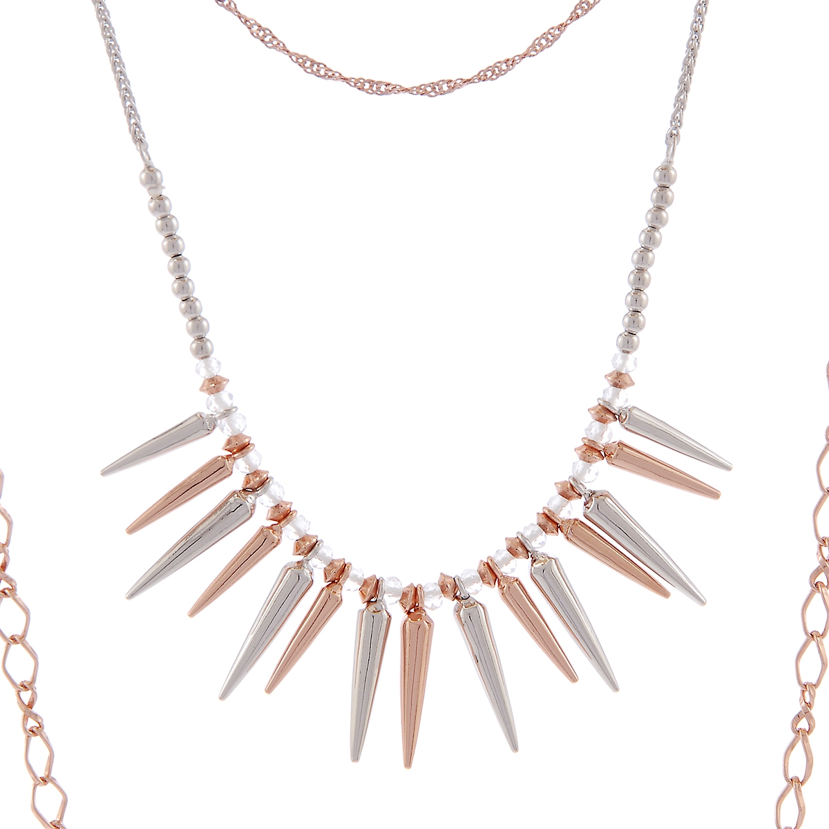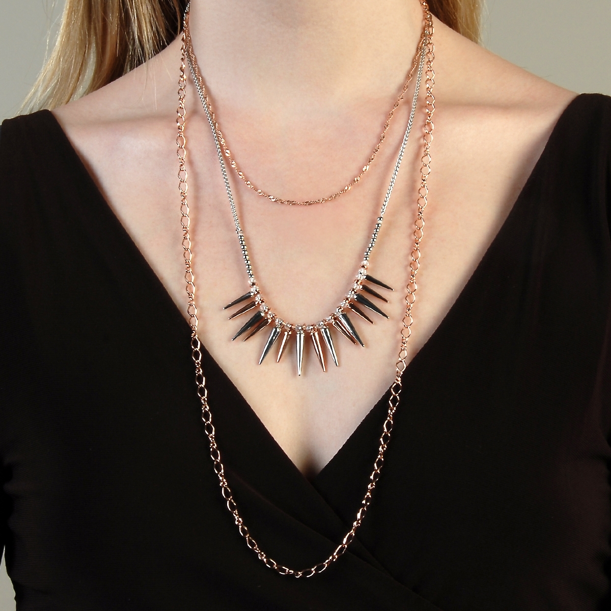Make a fashion statement when you wear our edgy “Power Glam” neckpiece. Its beautifully entrancing layers of rose gold, rich rhodium, crystal beads and spiked metal detailing command attention. 16" neckpiece with 2" extension. Nickel and lead free.