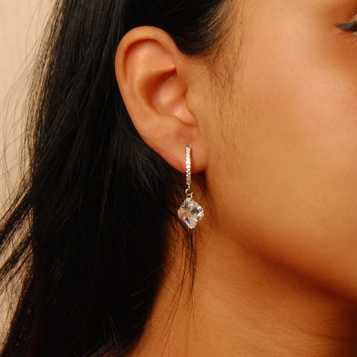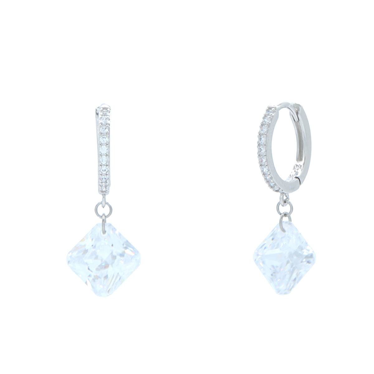 Our elegant "Sparkle and Go!" earrings flaunt a trendy huggie hoop design studded with clear AAA cubic zirconia and a contemporary diamond-shaped drop to give you that perfect extra dash of sparkle. Sterling silver posts. Nickel and lead free jewellery.
