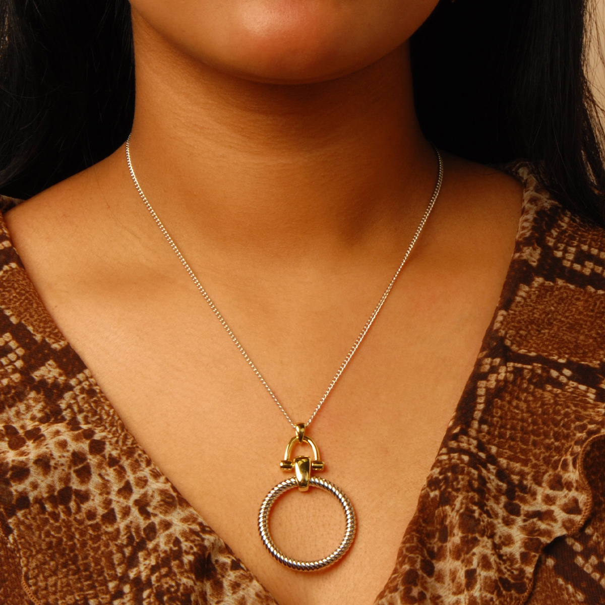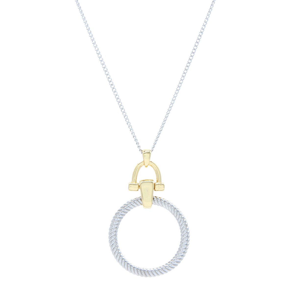 When bold and chic is all that will do our must-have "Style Force” neckpiece featuring a stunning rhodium finished circle on a playful golden stirrup is the showstopper you’ve been looking for. 18" chain with 2" extension. Lead and nickel free jewellery.